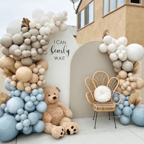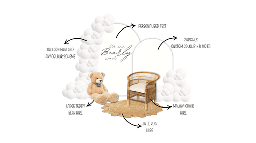 Includes: 2 Backdrop Arches | Personalised Sticker | Balloon Garland in your Colour Scheme | Large Teddy Bear | Malawi Chair | Jute Rug