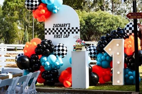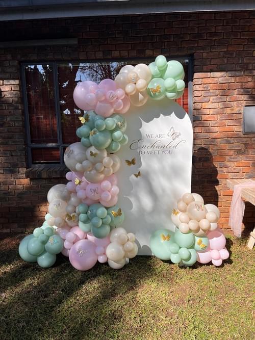Includes a white backdrop arch of your choice, personalisation on the backdrop, and any colour scheme balloon garland
